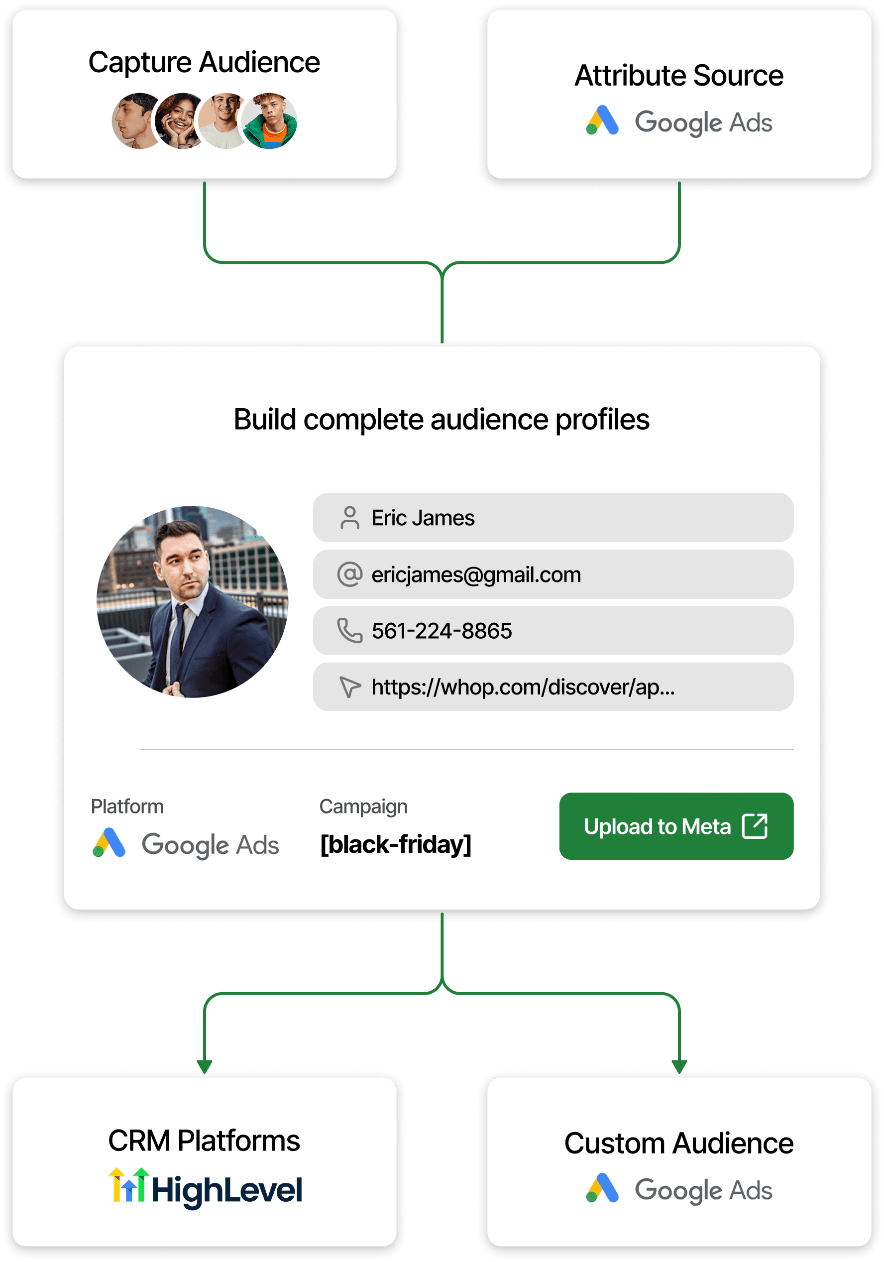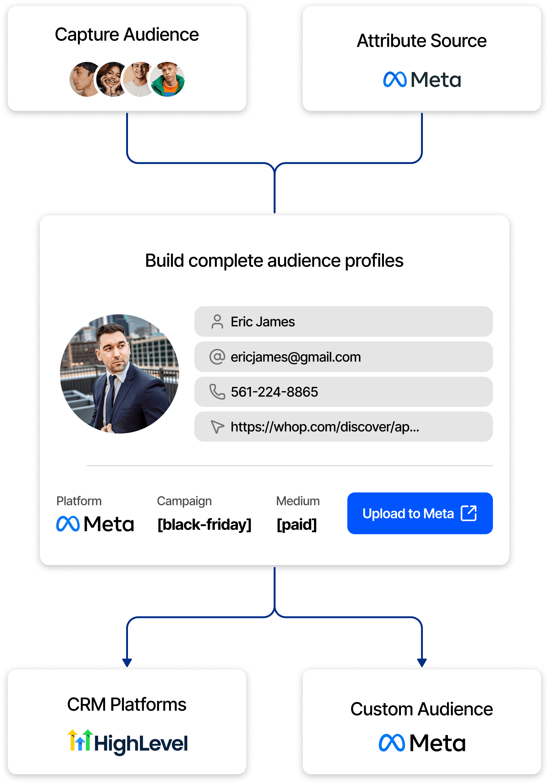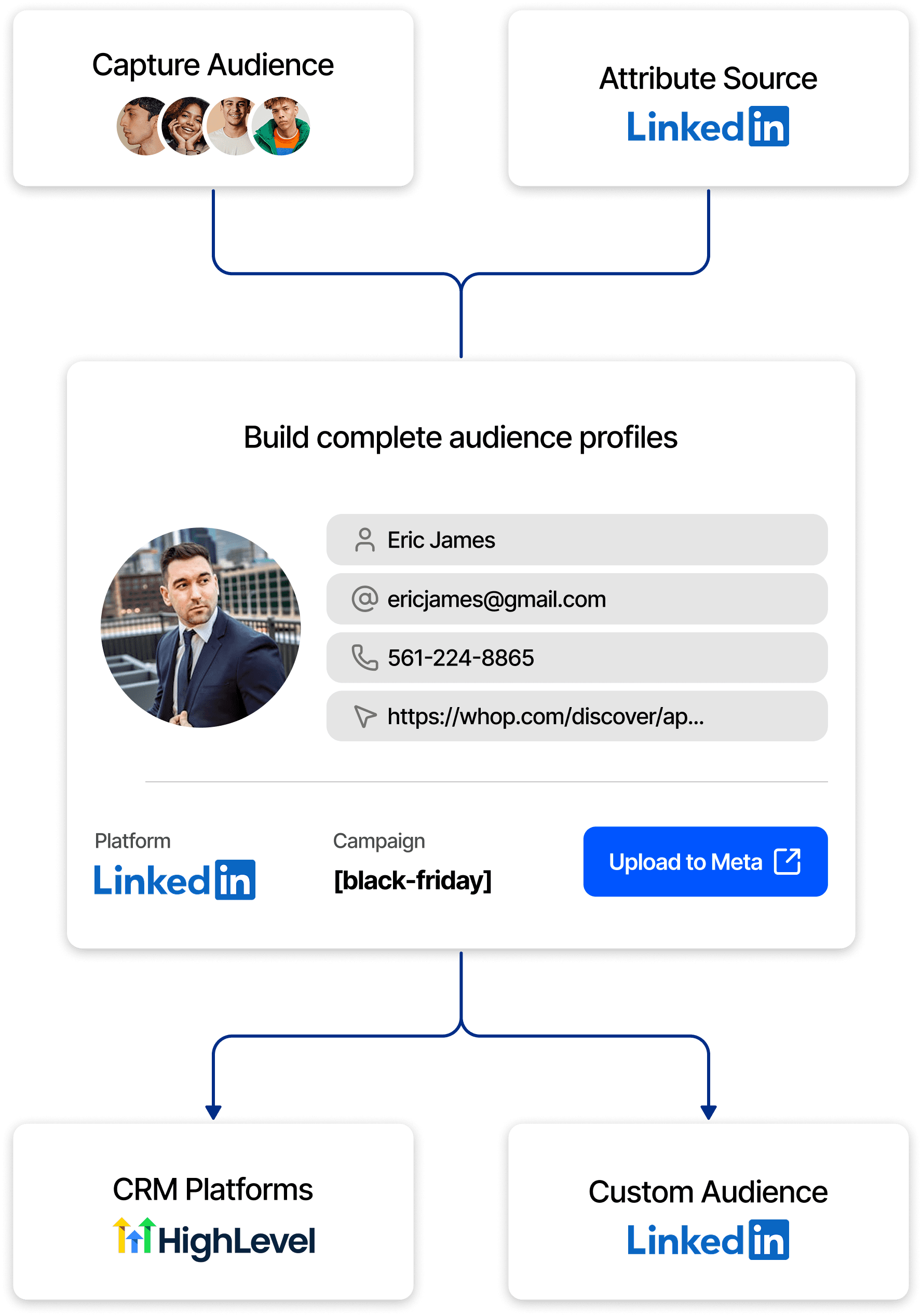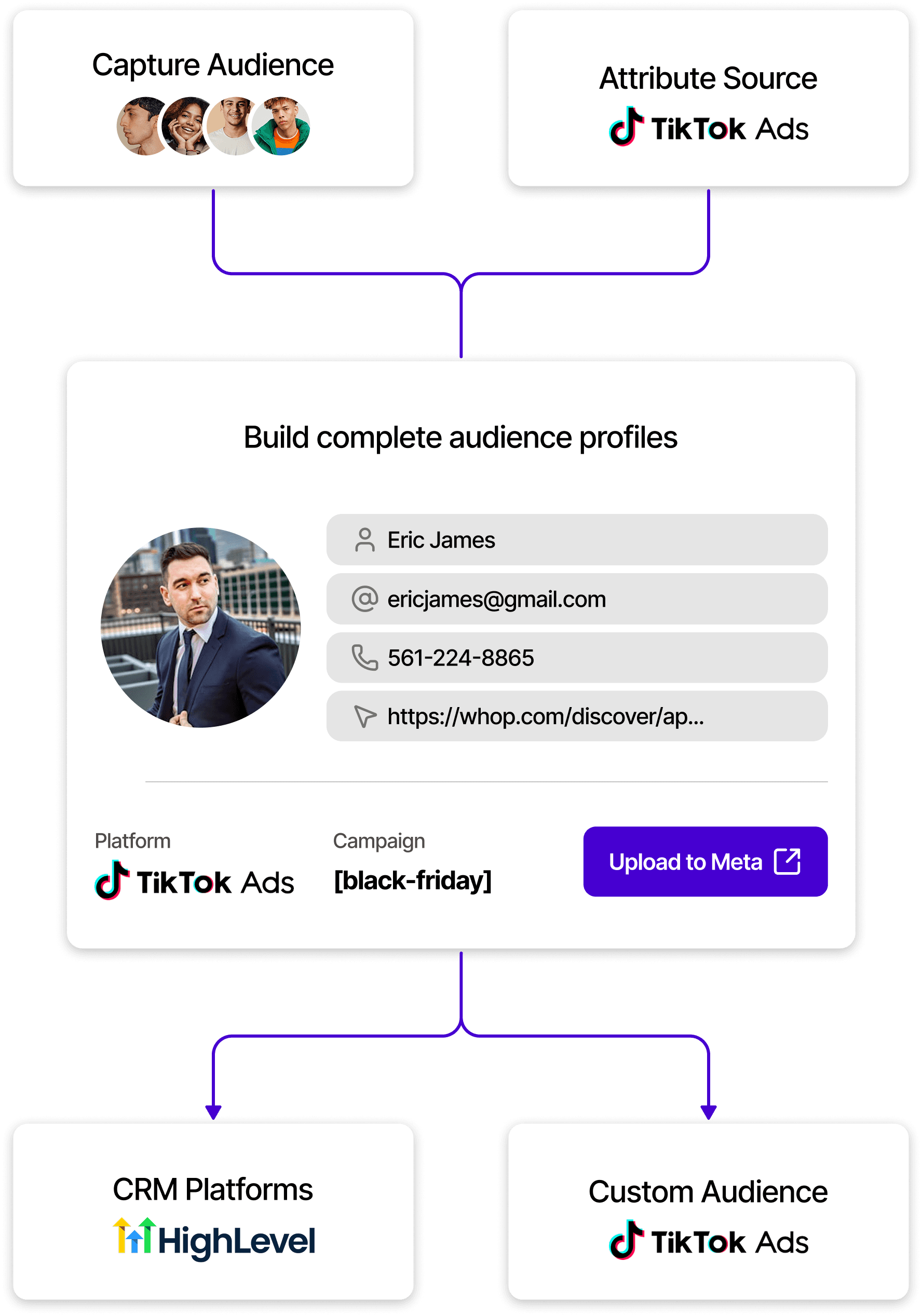 Feeds identified contacts into custom audiences to extend retargeting beyond past buyers
